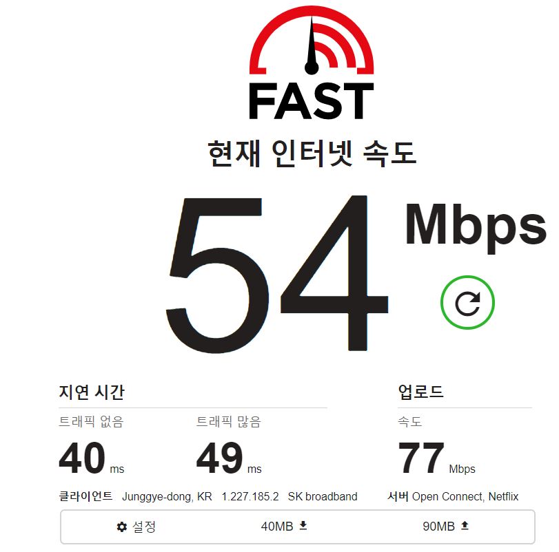 넷플릭스에서 제공하는 www.fast.com 입니다. 이 사이트에 들어가면 바로 인터넷 속도를 측정해줍니다.